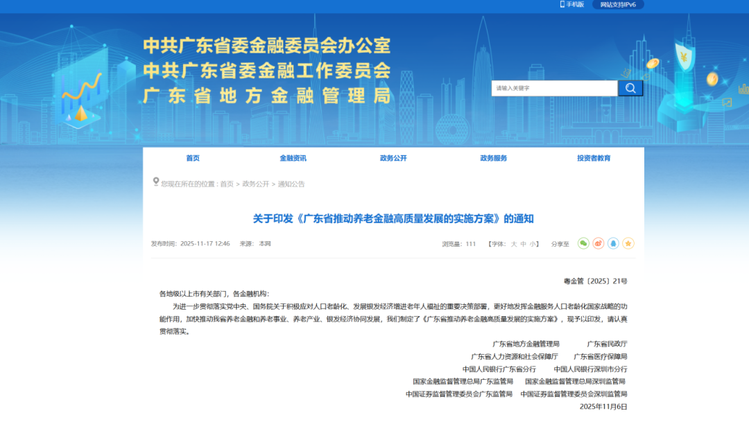 11月17日,广东省地方金融管理局发布《广东省推动养老金融高质量发展的实施方案》(下称《实施方案》)。《实施方案》由省地方金融管理局会同省民政厅、省人力资源和社会保障厅、省医疗保障局、人民银行广东省分行、人民银行深圳市分行、广东金融监管局、深圳金融监管局、广东证监局、深圳证监局等多部门联合印发,系广东首次出台养老金融专属政策。