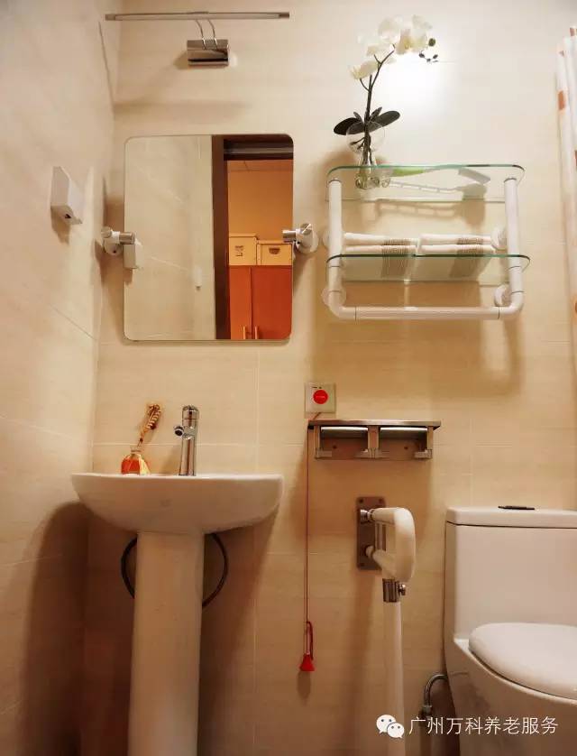 卫生间采用干湿分离的区域设计。浴室设电暖灯,保证长者沐浴环境的温度。防水淋浴坐凳,防水防滑,满足坐浴,高度450mm,方便长者起坐,辅助长者洗澡淋浴时能更安全,且坐板有排水孔,排除污垢,供长者在最合适的位置安心完成洗浴动作。长柄沐浴刷、长柄梳,适合长者(尤其上肢活动不便的长者)沐浴、梳头使用,均采用环保材质,使用舒适方便。