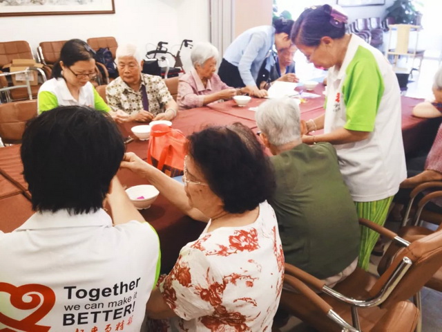 来自越秀区的中、老年志愿者团队,为提高定期来院服务质量,不断更新服务内容,她们积极报名参加艺术学校的手工课,每次刚学会新的手工花样,就集体来院与长者一起交流制作,还无私地为长者提供手工制作材料,服务精神令人感动。