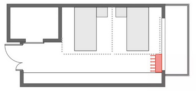 空调设在床头,空调下的床位会受到空调直吹的影响,当使用隔帘时 会影响另一张床的制冷效果。房间内的温度难以均衡。此设置位置不应被选用。