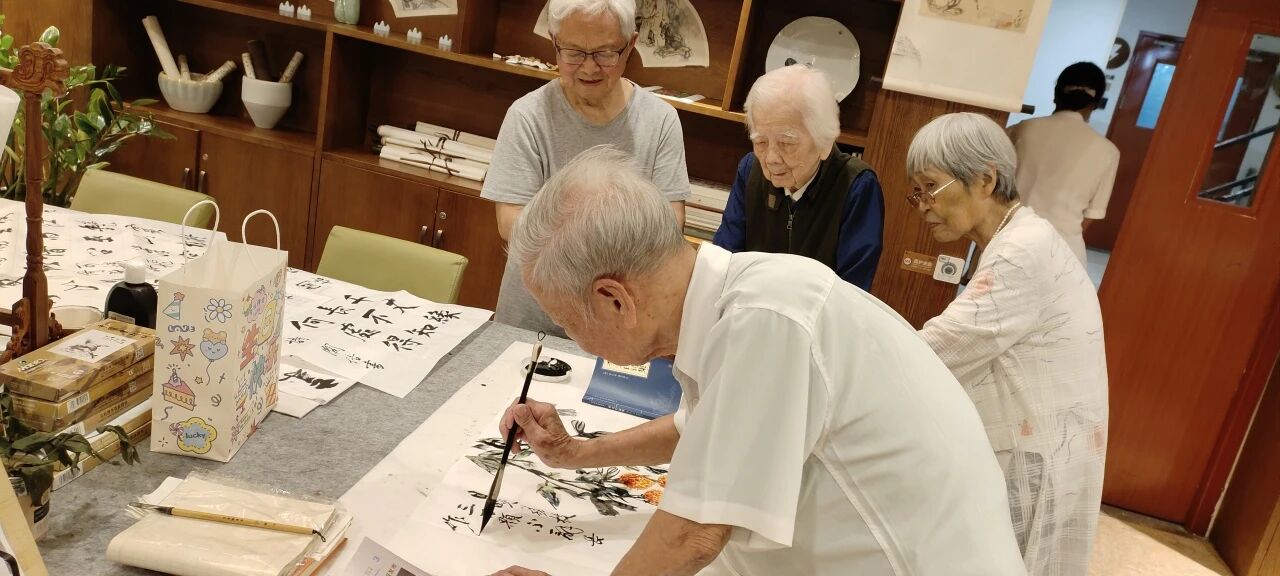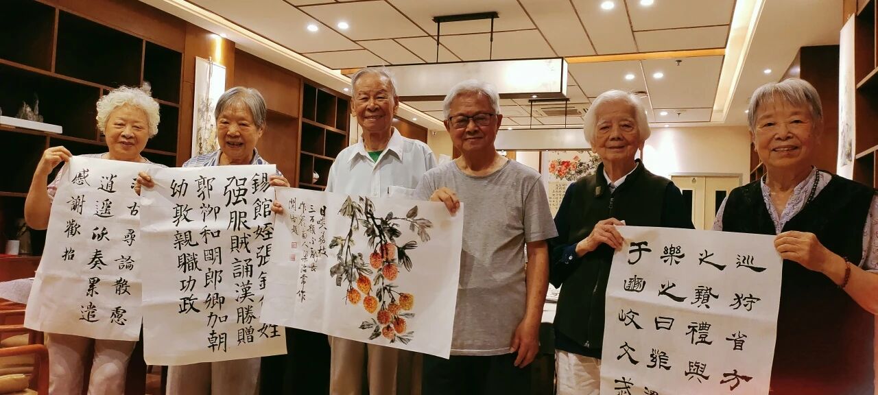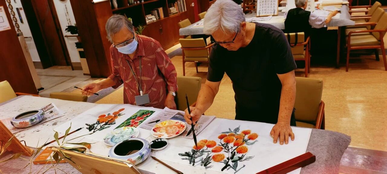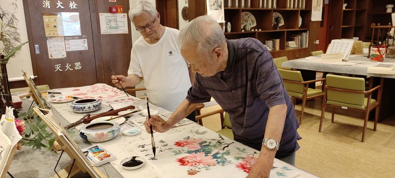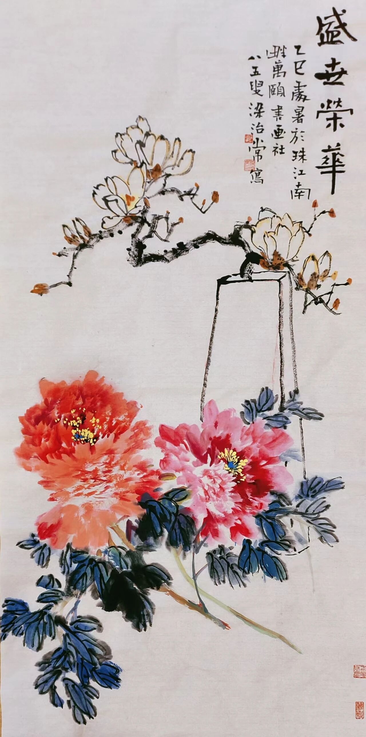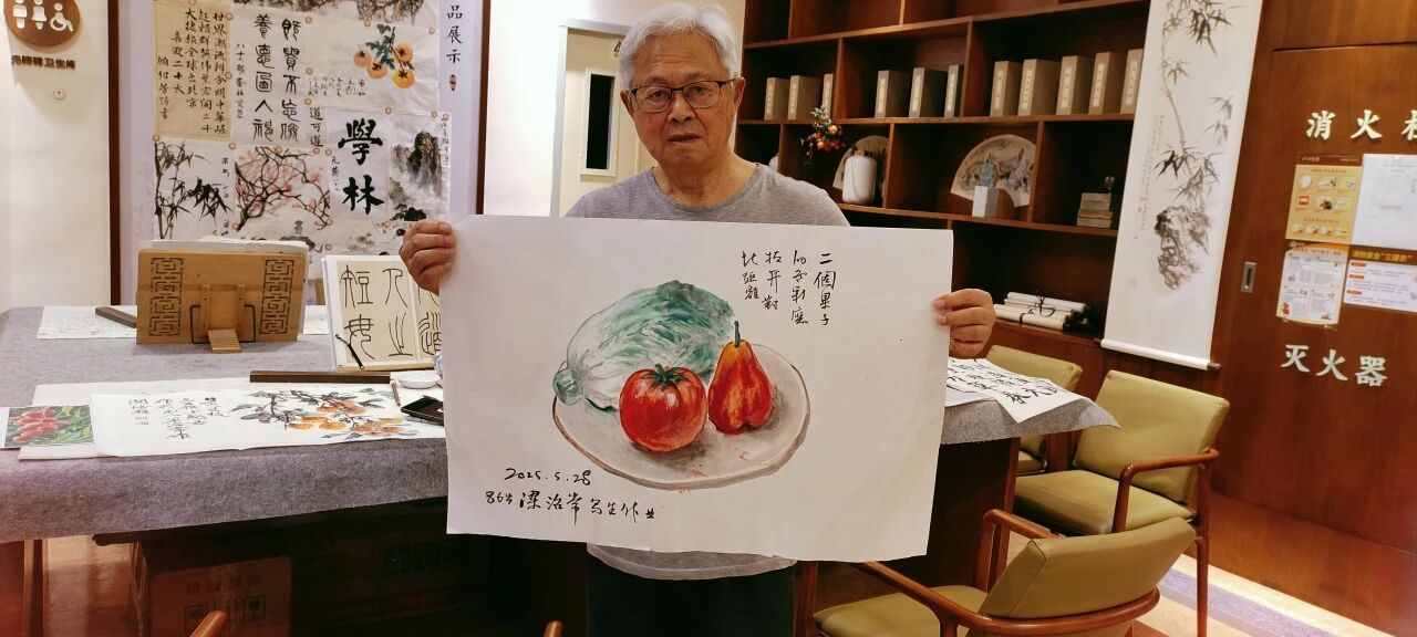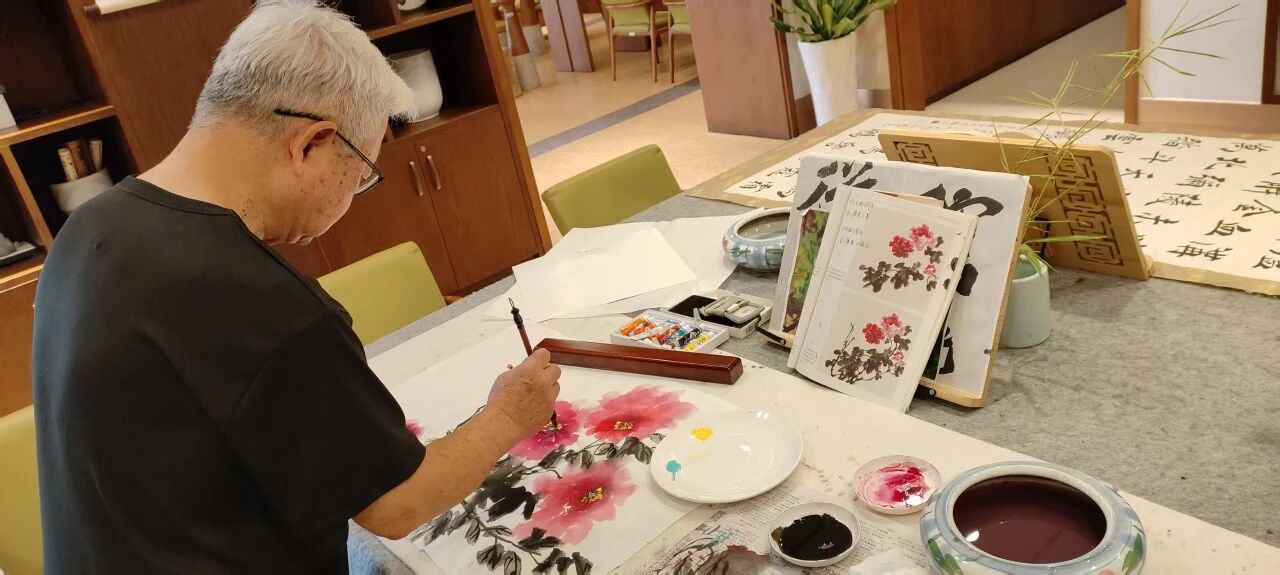 年届八十六岁的梁叔,平时雅好书画,尤钟好画牡丹。滨江中榕悦良好的书画研习环境恰如传统文化沃土,助力他快速悟得写意牡丹的入门要诀,更点燃其深耕书画的热忱。他于艺事上勤勉不辍:每周国画课堂从不缺席,闲暇时光,或临习经典范本悟其神韵,或观览国画教学视频研其技法,心摹手追两载有余,使他对传统写意国画的认知与技艺日臻精进,笔下牡丹亦渐具丰姿,雍容之态跃然纸上,常获院友与亲友交口称赞。家人亦全力襄助,不仅主动购置毛笔、颜料、宣纸等耗材,此次为了参赛投稿作品之需,更专程延请篆刻名家为其刊刻数枚印章,让作品更添金石雅韵。