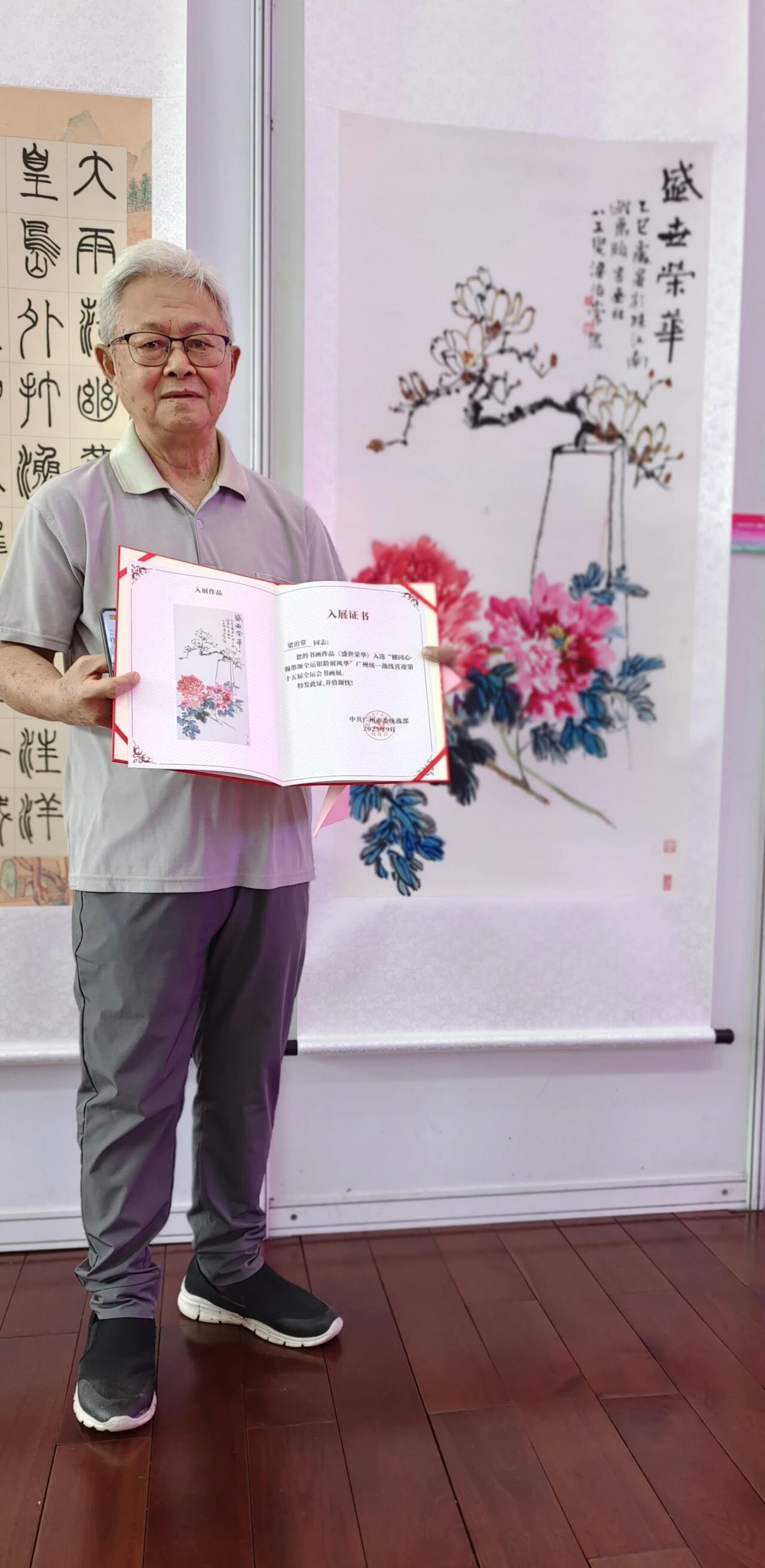 在万颐书画社指导老师勉励下,梁叔抱着“姑且一试”的从容心态参与本次市级书画征稿创作。他潜心参考名家作品,数日孜孜以求,终成一幅四尺牡丹图,画作构图新颖,牡丹的华贵典雅尽显于笔墨之间,更寓意对时代盛世的美好讴歌。投稿作品深得书画界资深评委青睐,这幅佳作不仅成功入展,更被主办方遴选为重点展品,悬挂于展厅前列的显要位置,成为本次展览中一抹亮丽的风景线。