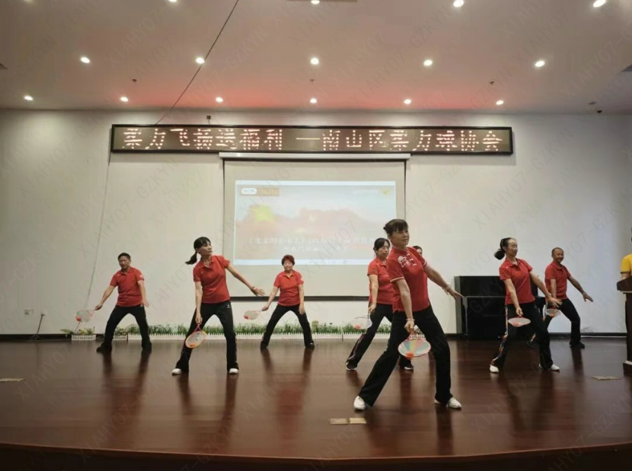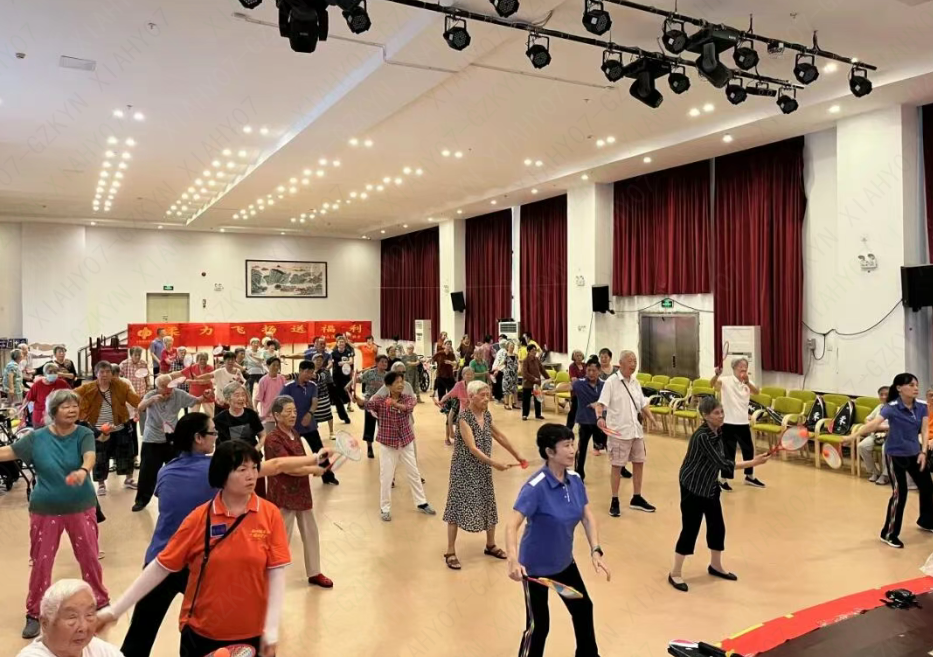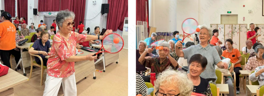 “您别着急,慢慢儿来,球顺着手臂的劲儿走。”“对啦,轻轻发力就成。” 队员们一边耐心地示范,一边细致地指导。长者们则像认真学习的孩童,虽动作略显生疏,脸上却始终洋溢着灿烂的笑容。在欢快的音乐声中,长者们与队员们一同挥动球拍,小小的柔力球在活动室里划出一道道温暖的弧线,整个场面热闹非凡,温馨满溢。