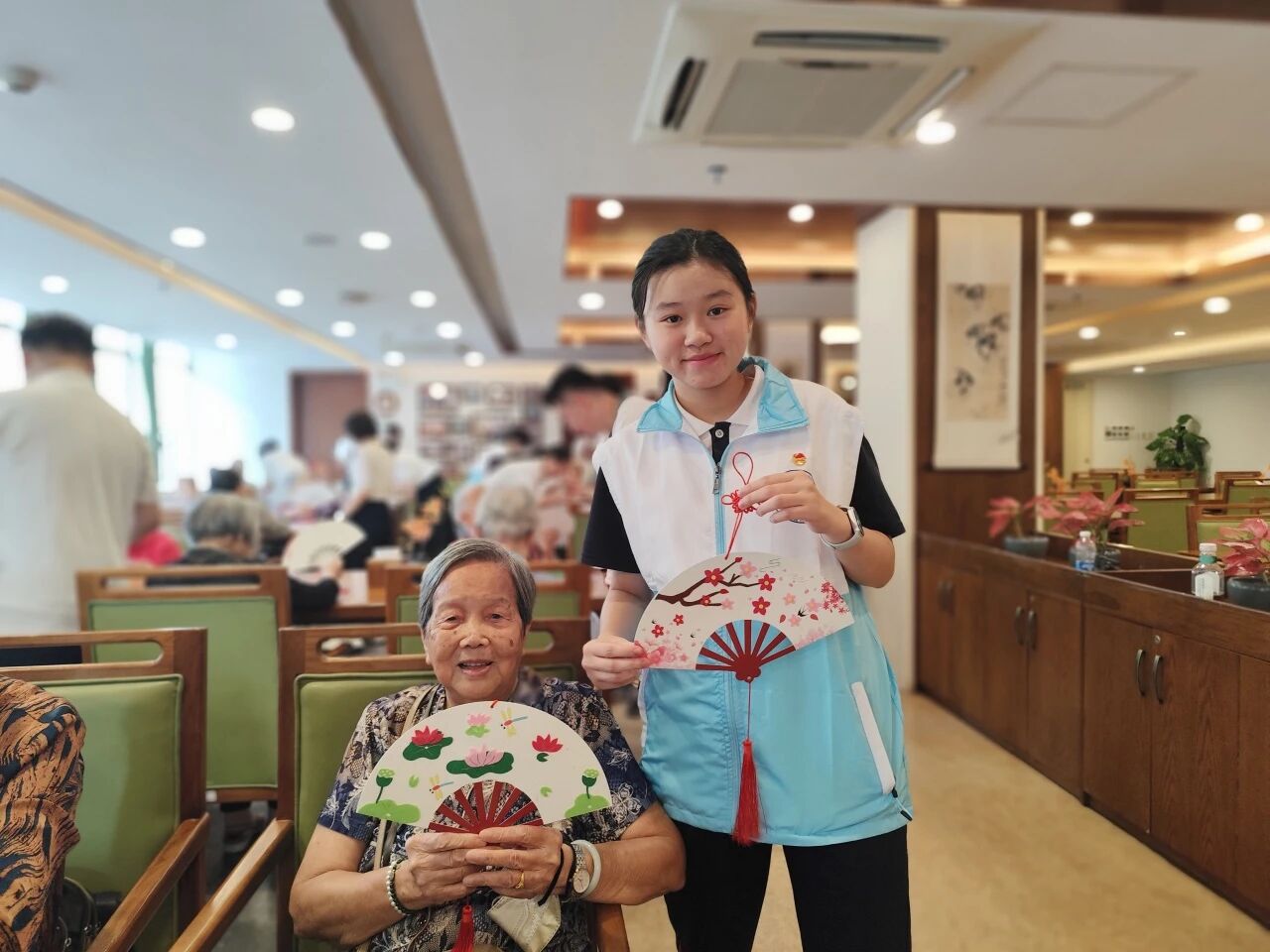 当一幅幅色彩明快、构思巧妙的扇面作品逐一完成,学生们又细心地帮长者检查装饰是否牢固,并亲手系上流苏,点缀丝带。“这是我人生第一把手工扇,多亏了这些懂事的孩子,太喜欢了!”刘姨捧着作品,拉着学生的手久久不愿松开。学生们也纷纷举起手机,为长者与作品定格美好瞬间,并许下温暖承诺:“下次我们还来,给您带我们画的明信片!”
