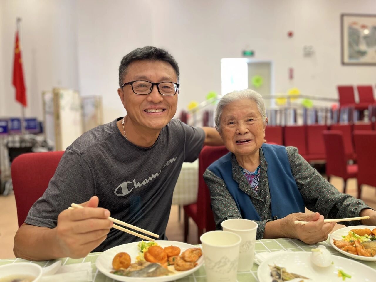 工作人员贴心服务,护理员伴餐献艺,社工团队捕捉每一个温馨瞬间,定格家庭团聚的珍贵画面。