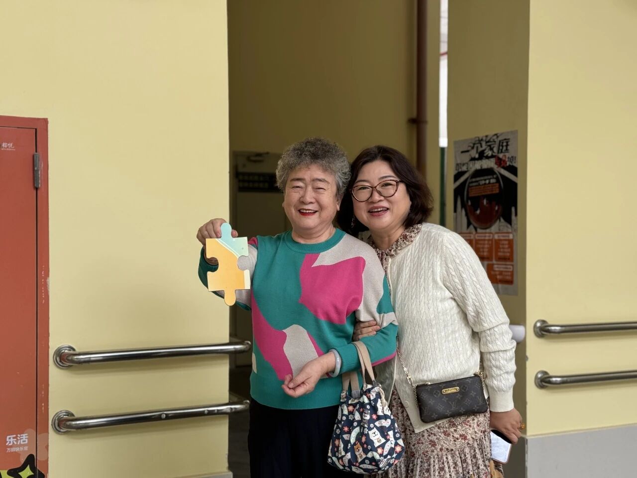 家属们牵着长者的手,细心寻找着拼图碎片,长者们之间也默契协作,每块拼图归位时都伴随着阵阵欢呼,亲情与邻里情在这一过程中不断升温。