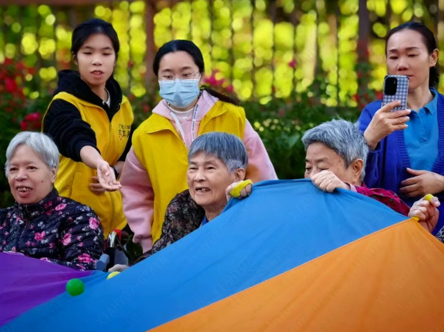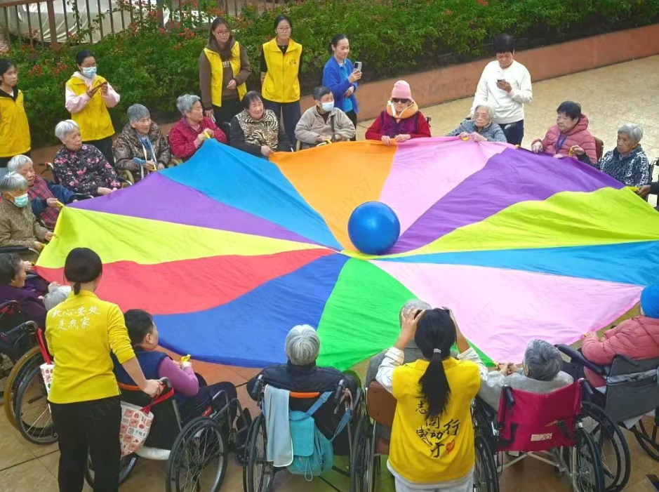 “彩虹伞”项目紧随其后,长者们紧握伞缘、齐心协作,社工一声指令,彩色小球便如吉祥物“喜洋洋”“乐融融”般在伞边起舞。蔡姨有感而发:“团结才有力量,这就是全运精神!”