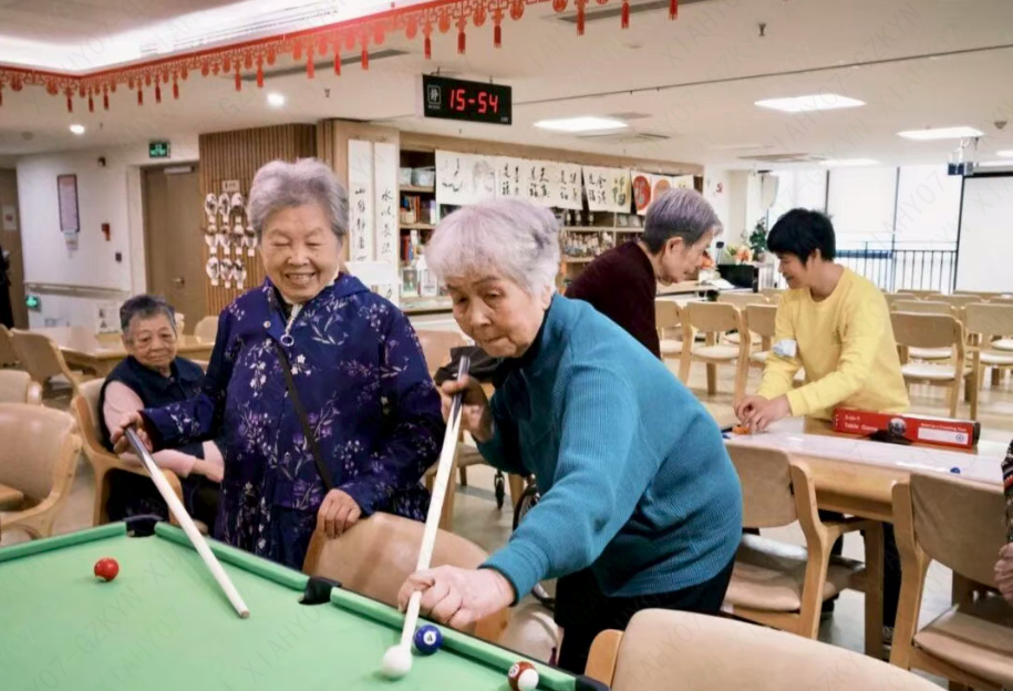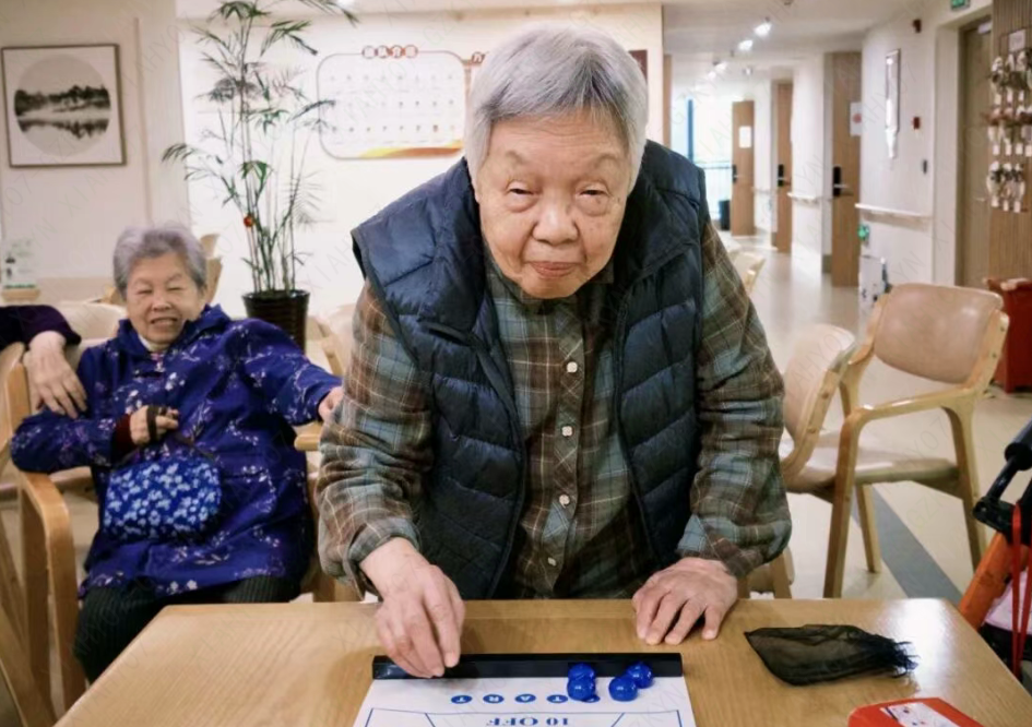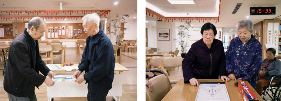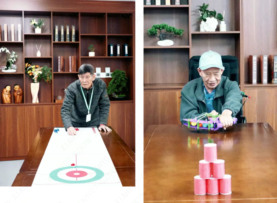 餐桌上,冰壶、迷你台球、桌上保龄球等道具摆放整齐。吴姨和张姨率先体验冰壶,于叔见状也加入其中,现场笑声不断。