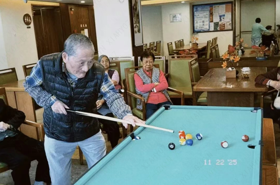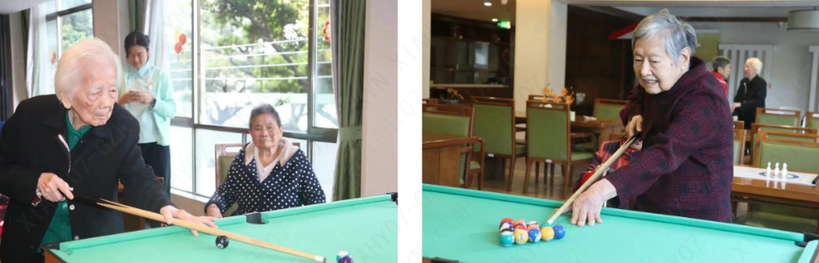 氛围轻松惬意,毫无竞争压力。玩迷你台球时,社工蹲身帮关姨调整球杆角度;打桌上保龄球时,耐心鼓励失误的吴姨“再试一次”。活动现场笑语连连,欢呼声不断。