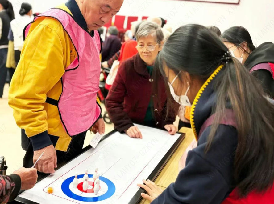 运动会设置冰壶大挑战、趣味射箭、“滚动吧!”保龄球三大项目,长辈们热情高涨、各显身手。保龄球环节中,经验丰富的吴爷爷不仅贴心指导工作人员调整球具摆法,更凭借精湛技艺勇夺桂冠。
