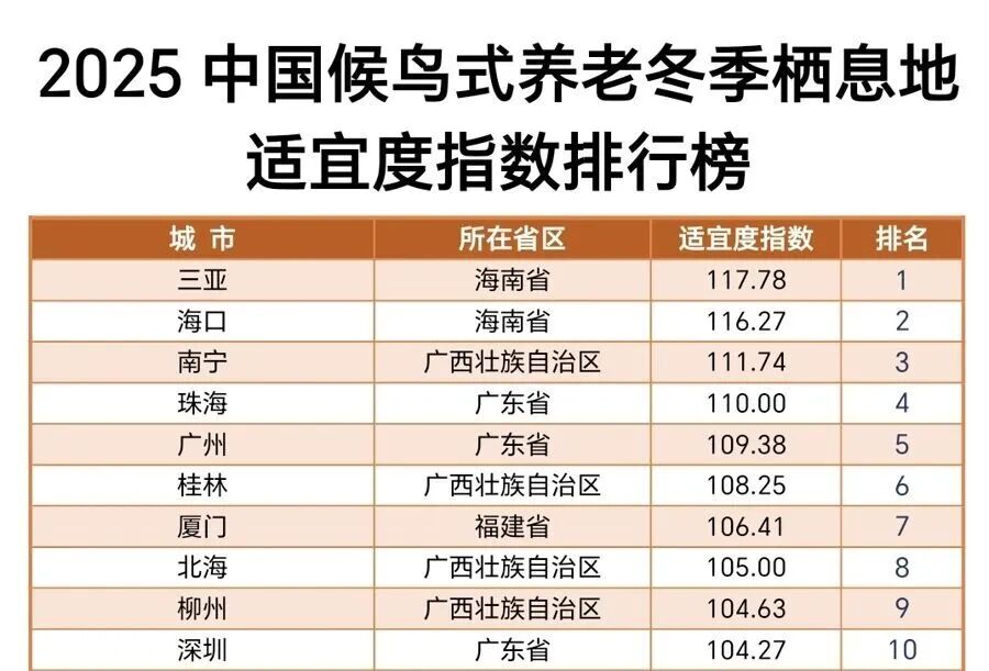 在最新发布的《2025 中国候鸟式养老冬季栖息地适宜度指数》中