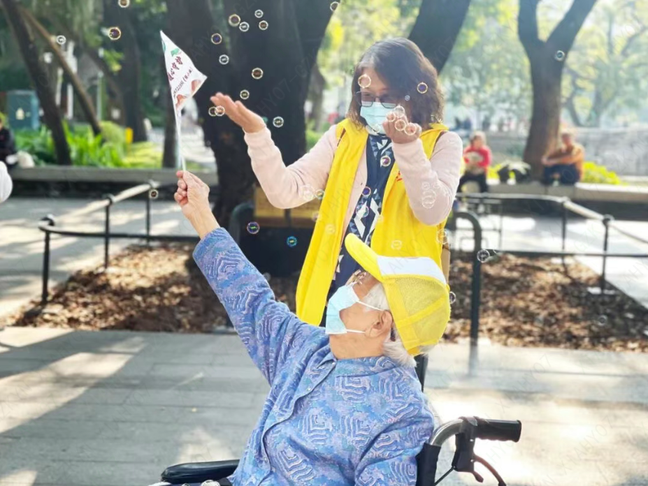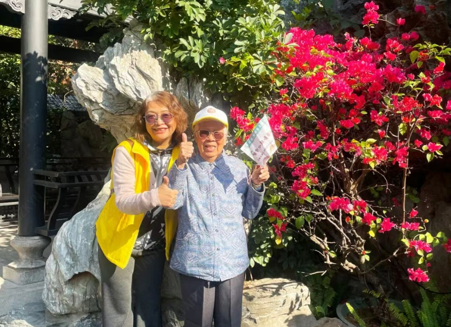 行至中途,社工贴心安排了一段休憩时光。长者们围坐树荫下,你递一块水果,我分一口点心,边吃边聊家常、话趣事。“这提子真甜!”“这饼干酥脆可口!”赞叹声此起彼伏,爽朗的笑声随微风飘散,久久不息。