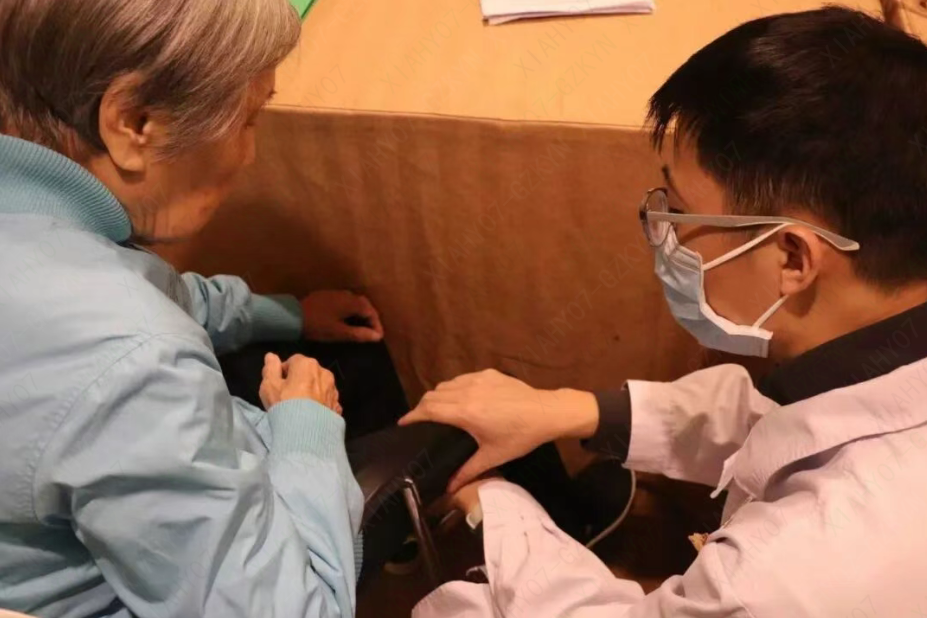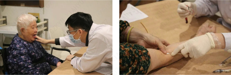 他们俯身查看疼痛部位,仔细观察舌苔,用心听诊心音与肠鸣音,并详细询问既往病史、用药情况及日常生活习惯,力求全面掌握每位长者的健康状况。针对血糖偏高的长者,医生建议严格控制主食摄入,减少高糖高脂食物,同时坚持规律监测血糖,根据数值动态调整饮食与生活方案;对于夜间频繁抽筋的长者,医护人员不仅推荐进行电解质(离子)筛查,还温馨提醒注意下肢保暖、避免受凉,并建议每日适度拉伸、定时温水泡脚,以缓解肌肉紧张、改善血液循环。