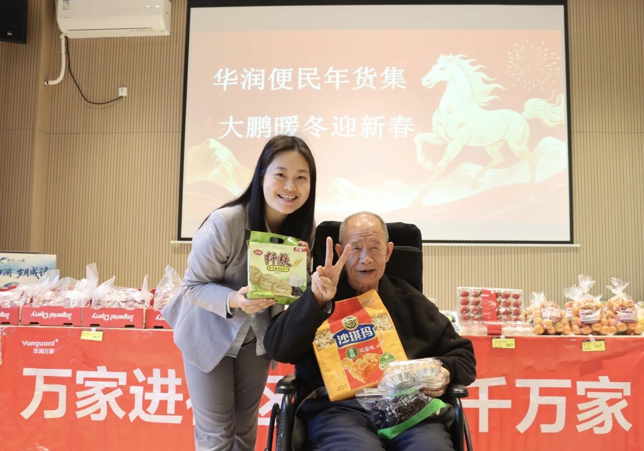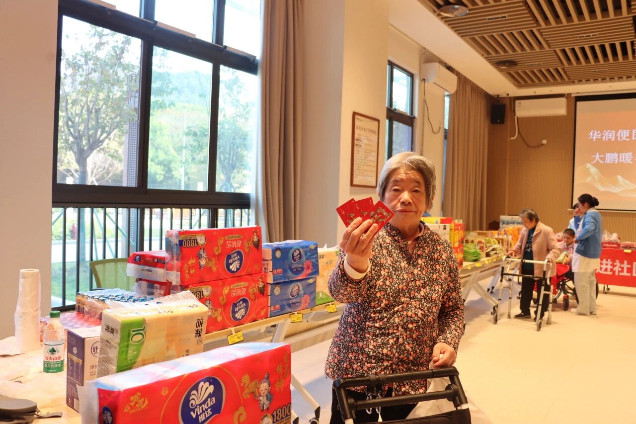 活动当日,大鹏颐养中心的庭院里早已暖意融融、笑语盈盈。华润超市的工作人员早早到场,将满满当当的货架 “落户” 园区。营养健康的蛋奶透着鲜香,干货满满的坚果糕点裹着香甜,实用便捷的日用百货整齐排开,琳琅好物堪比繁星点缀,看得人眼花缭乱。