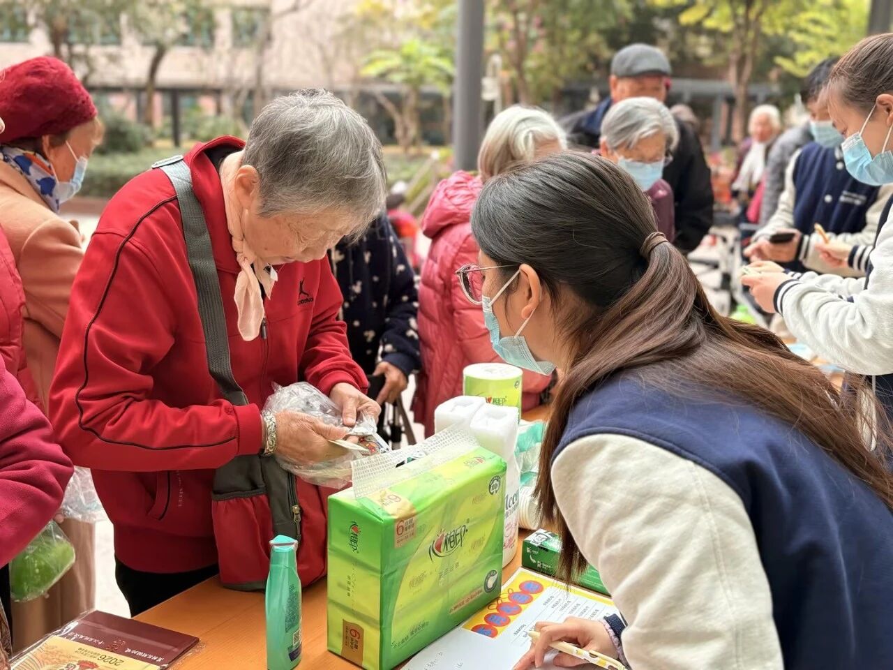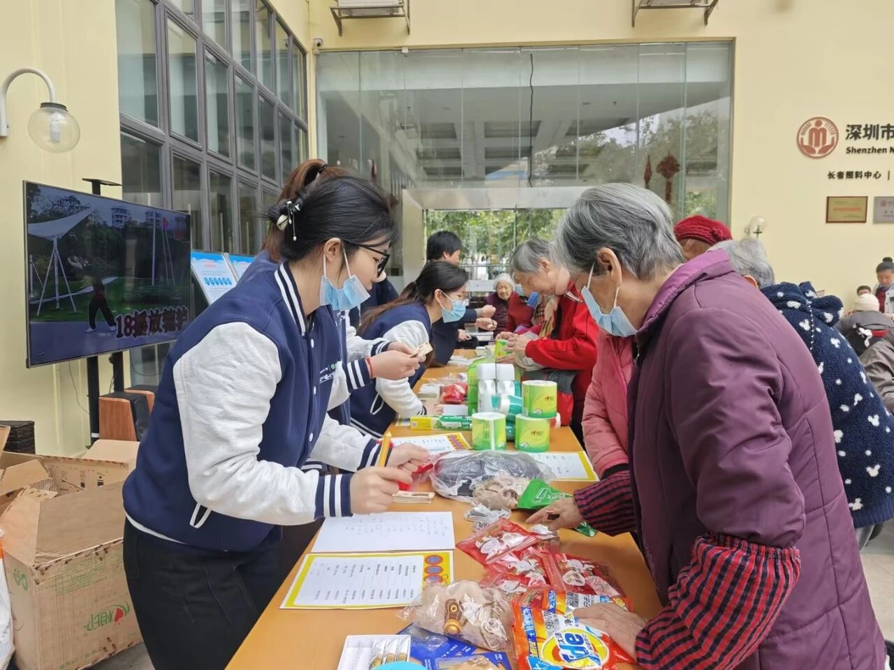 兑换区里,长者们或用游戏赢得的物资币,或用以往积攒的“积蓄”,兴致勃勃地挑选心仪礼品。工作人员全程耐心引导、细心协助,每一份礼品的递送都伴随着真诚的祝贺,一句句暖心话语、一个个温柔举动,让整个年货节满是家人般的温情。