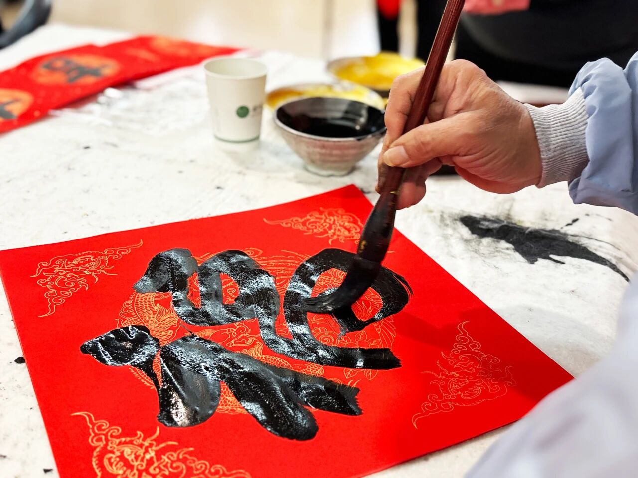 案几铺红,笔墨备妥。大师们或拿出精心准备的迎春年画,或饱蘸浓墨直接挥毫,一个个形态饱满的 “福” 字、一副副年味十足的对联跃然纸上。笔尖起落间,是汉字的韵律之美,更是刻在骨子里的新春期盼。