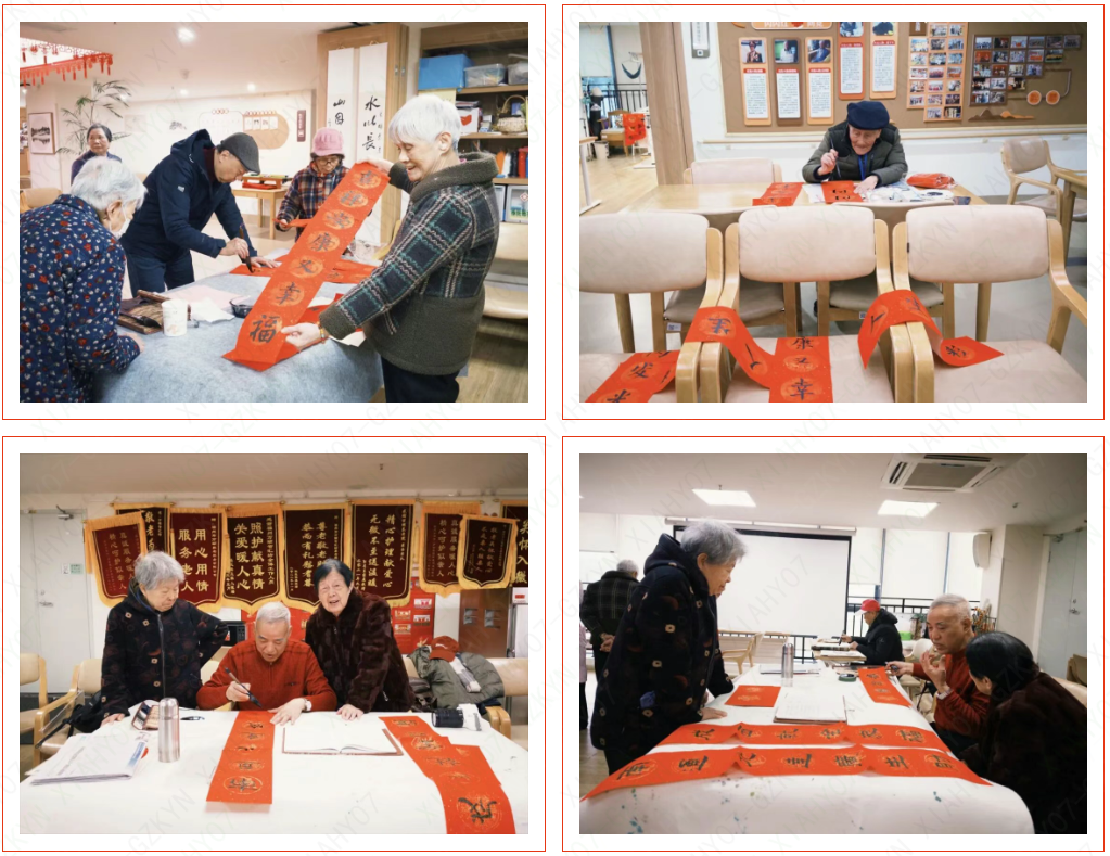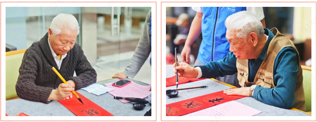 活动现场,中兴书法协会的志愿者们挥毫泼墨,“龙腾盛世千家喜”“福寿康宁松鹤韵”,一副副寓意美好的春联跃然纸上,苍劲的笔法引来长者们阵阵赞叹。更惊喜的是,院内书法爱好者戴爷爷、樊奶奶也自信提笔,隶书 “福” 字端庄浑厚,行楷对联飘逸洒脱,尽显 “老有所为” 的别样风采。