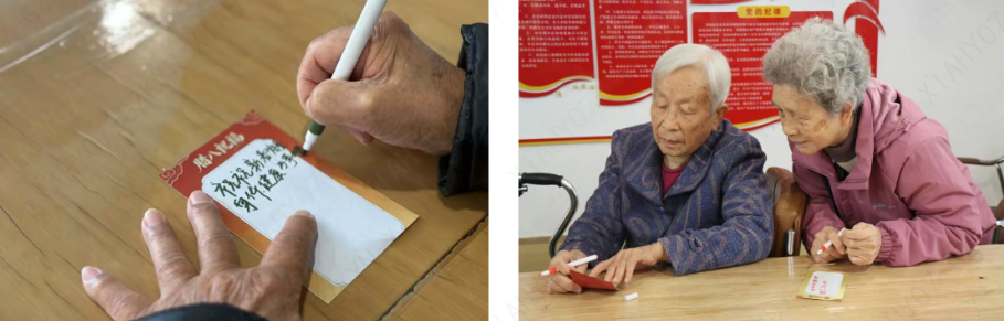知识分享过后,便是温情的祝福接龙。叔叔阿姨们在“福气纸”上认真写下心愿:“祝愿大家马年大吉”“祝福榕悦家人安康”……一句句真挚的话语贴满祝福墙,汇成温暖的海洋。杨叔望着满墙心意,感动地说:“谢谢你们,让节日这么有仪式感!”