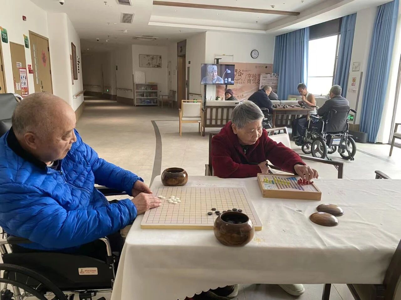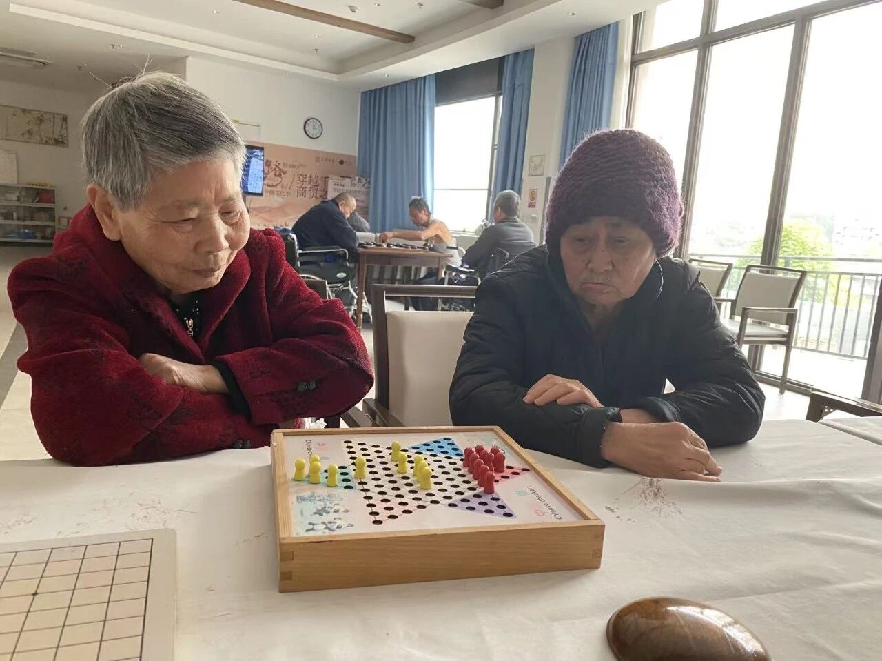 象棋桌旁,两位爷爷屏息对局。红方“炮”镇中路,黑方“马”踏边陲,步步暗藏机锋。观战的奶奶忍不住轻声提醒:“当心你的‘将’呀!”引来一阵会心的笑意。另一边,几位奶奶围坐玩跳棋,黄珠与红珠在六角格间穿梭追逐,时而搭桥、时而拦截,每次成功的跳跃都伴着爽朗笑声。还有一对长者静静对坐手谈,黑白交错间,尽是从容与智慧。